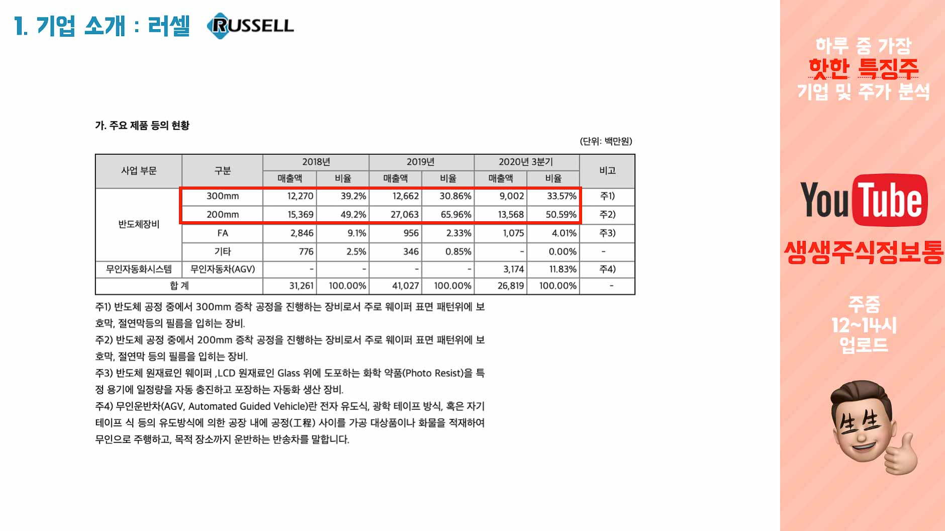 러셀은 크게 두가지 사업을 합니다. 반도체 장비 리퍼비시와 무인운반차 사업입니다.