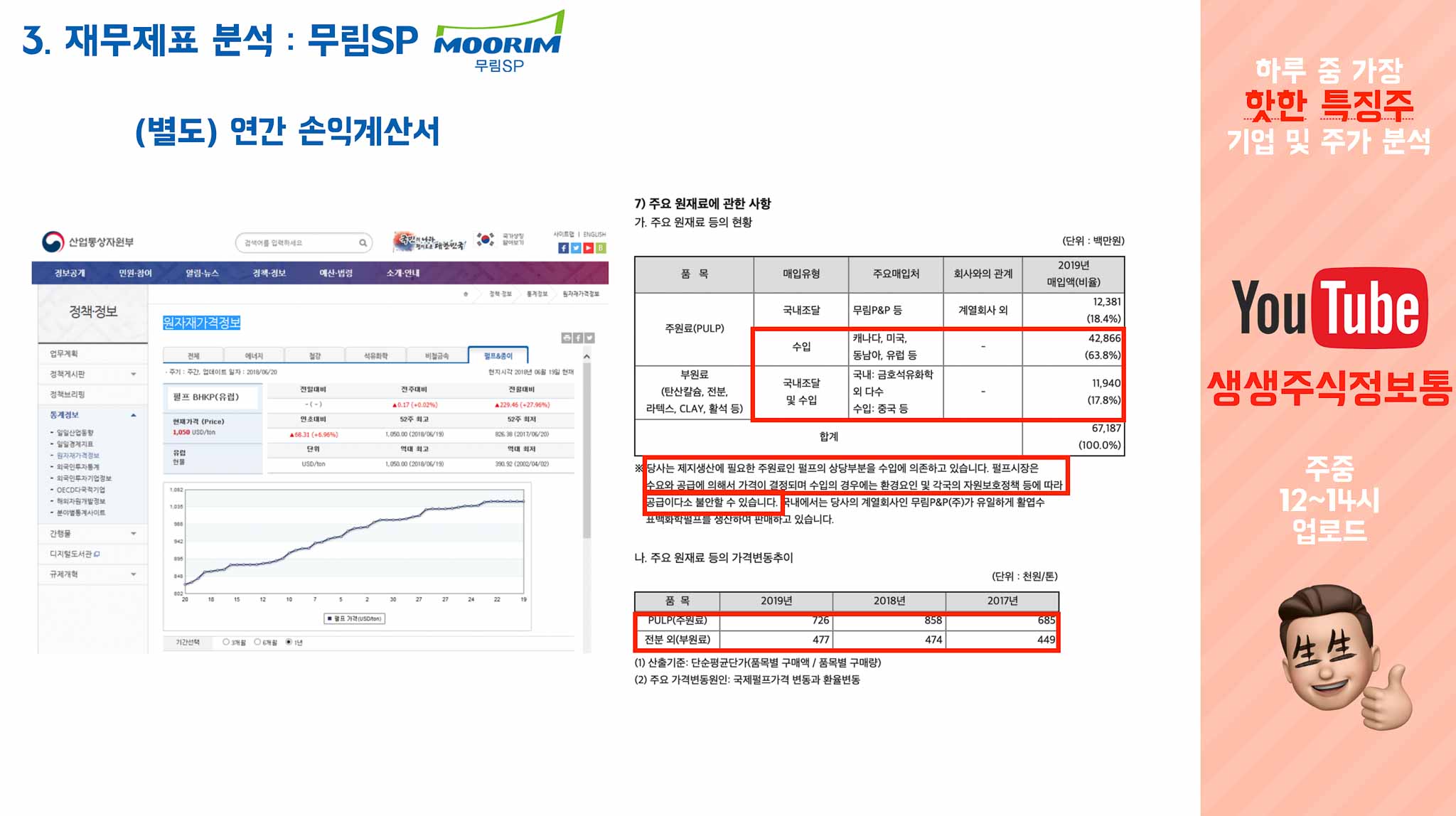 따라서 국제펄프값이 오르면 제지 만드는 무림P&P에는 좋을수도 있지만, 무림SP에게는 그보다 더 많은 제지 생산에 필요한 80%를 수입하니 당연히 매출원가가 오를 수 밖에 없습니다.