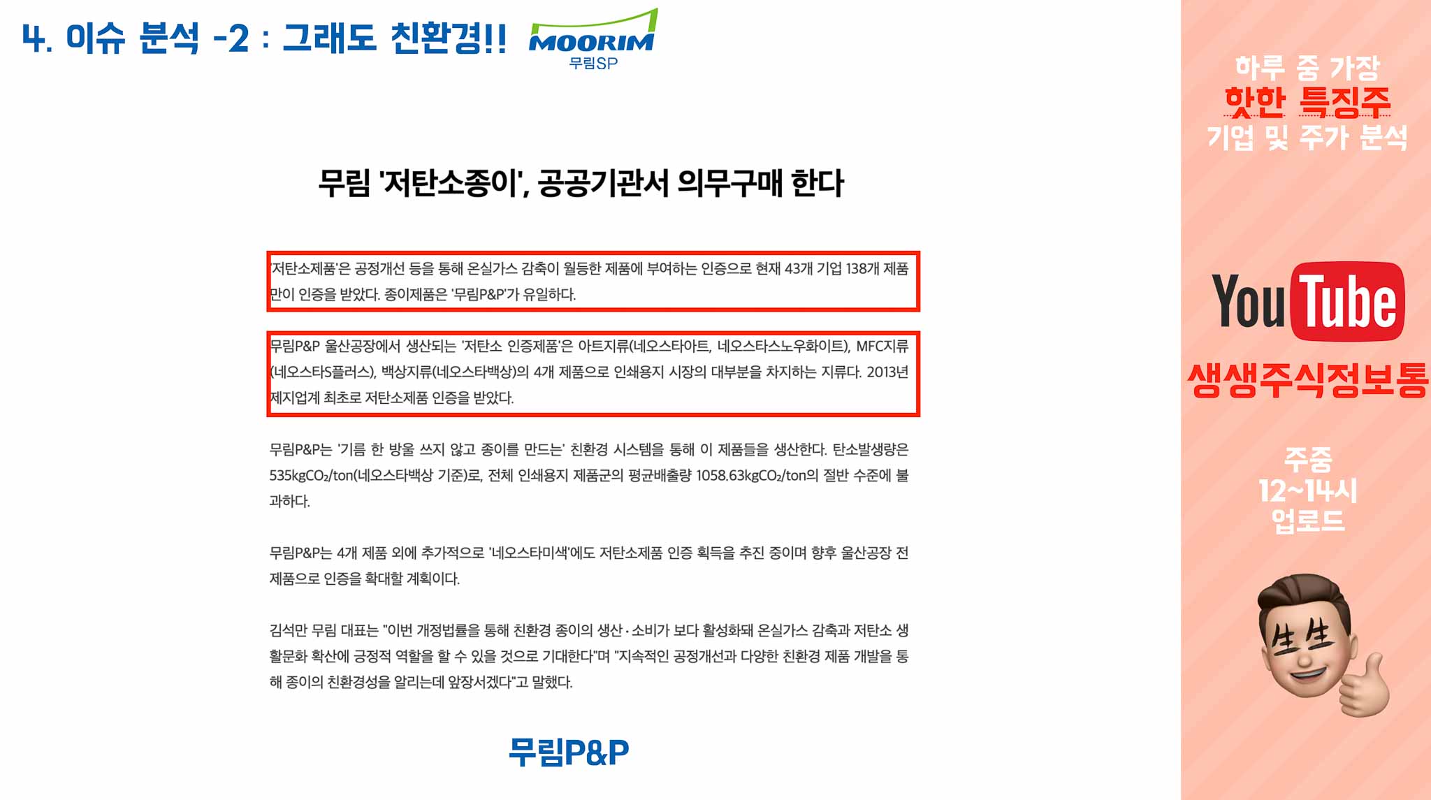 그리고 옆에는 무림P&P에 관한 기사인데, 국가에서 공공기관에는 저탄소 상품들을 의무구매하게 한다. 그리고 국내 제지회사중에 저탄소 제지는 무림P&P 밖에 없다는 기사입니다.