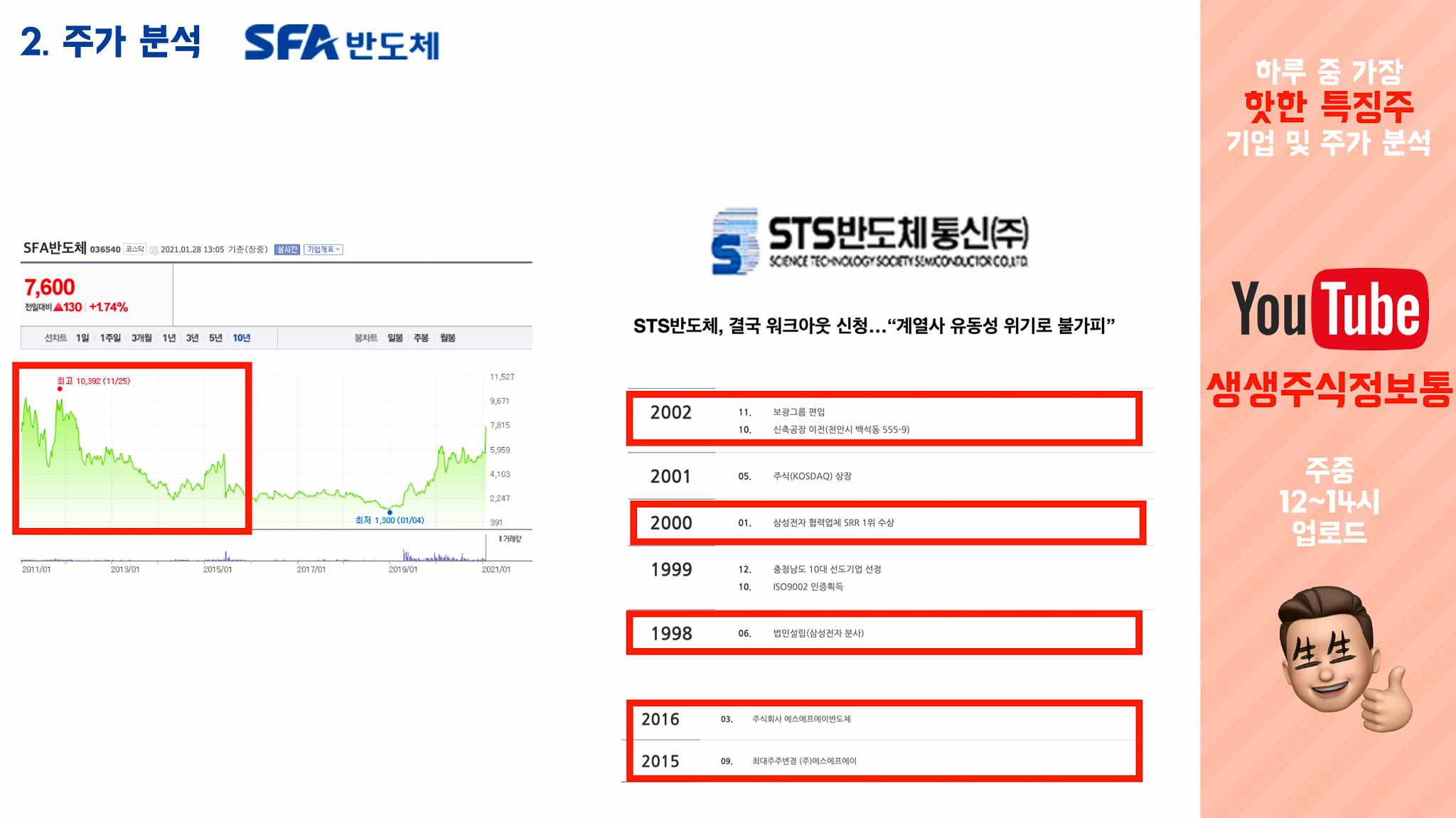 SFA반도체는 원래 STS반도체였습니다. STS는 1998년 삼성전자에서 분사된 것으로, 2000년에는 삼성전자 협력업체 1위 수상, 그리고 2001년에는 코스닥에 상장하고, 2002년에는 뭐 범삼성가라고 볼 수 있는 보광그룹에 편입이 되었습니다.