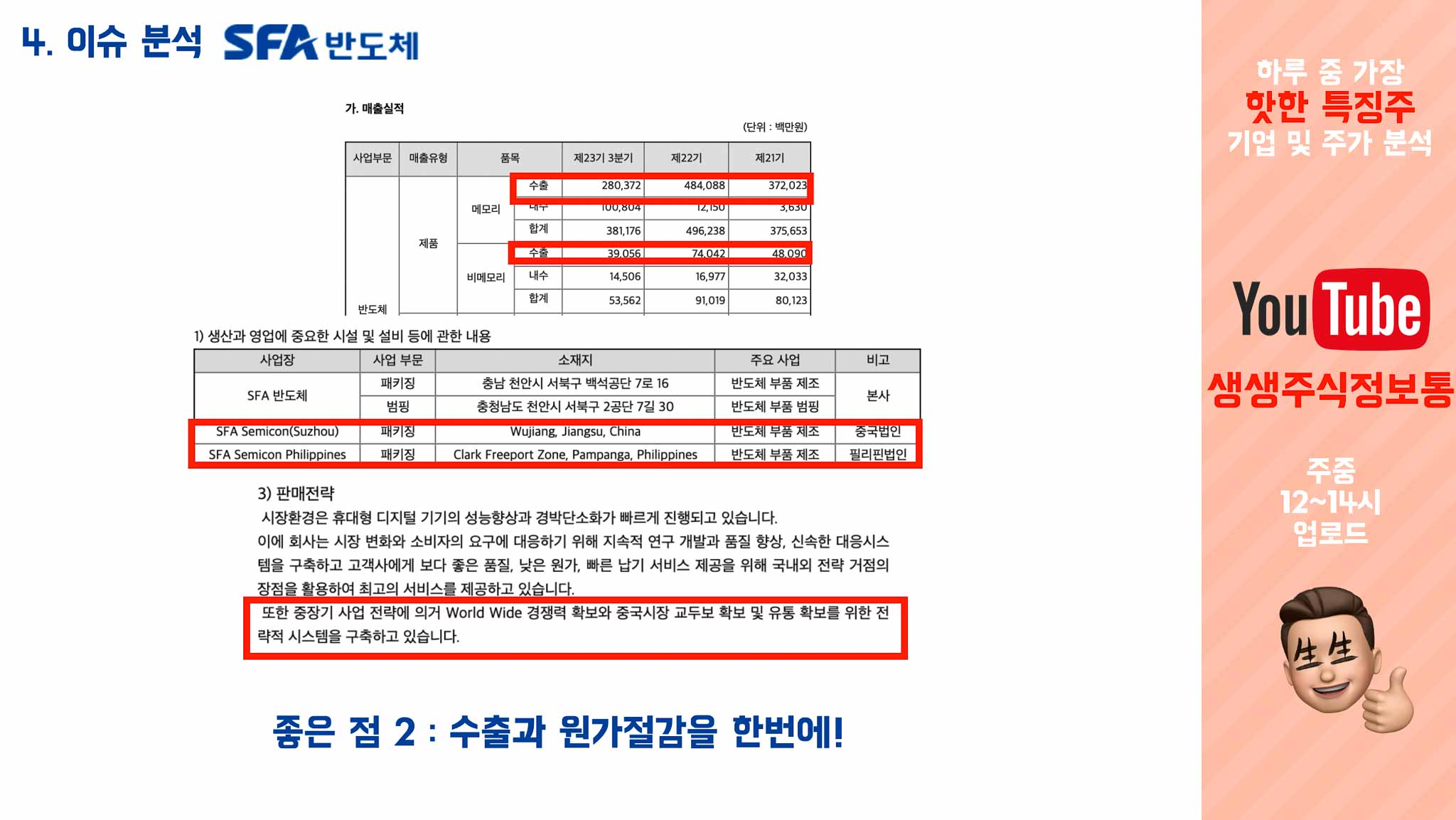 SFA반도체는 필리핀에 공장을 증설하는 등, 원가 절감과 수출을 동시에 잡을 수 있는 여력이 있습니다.