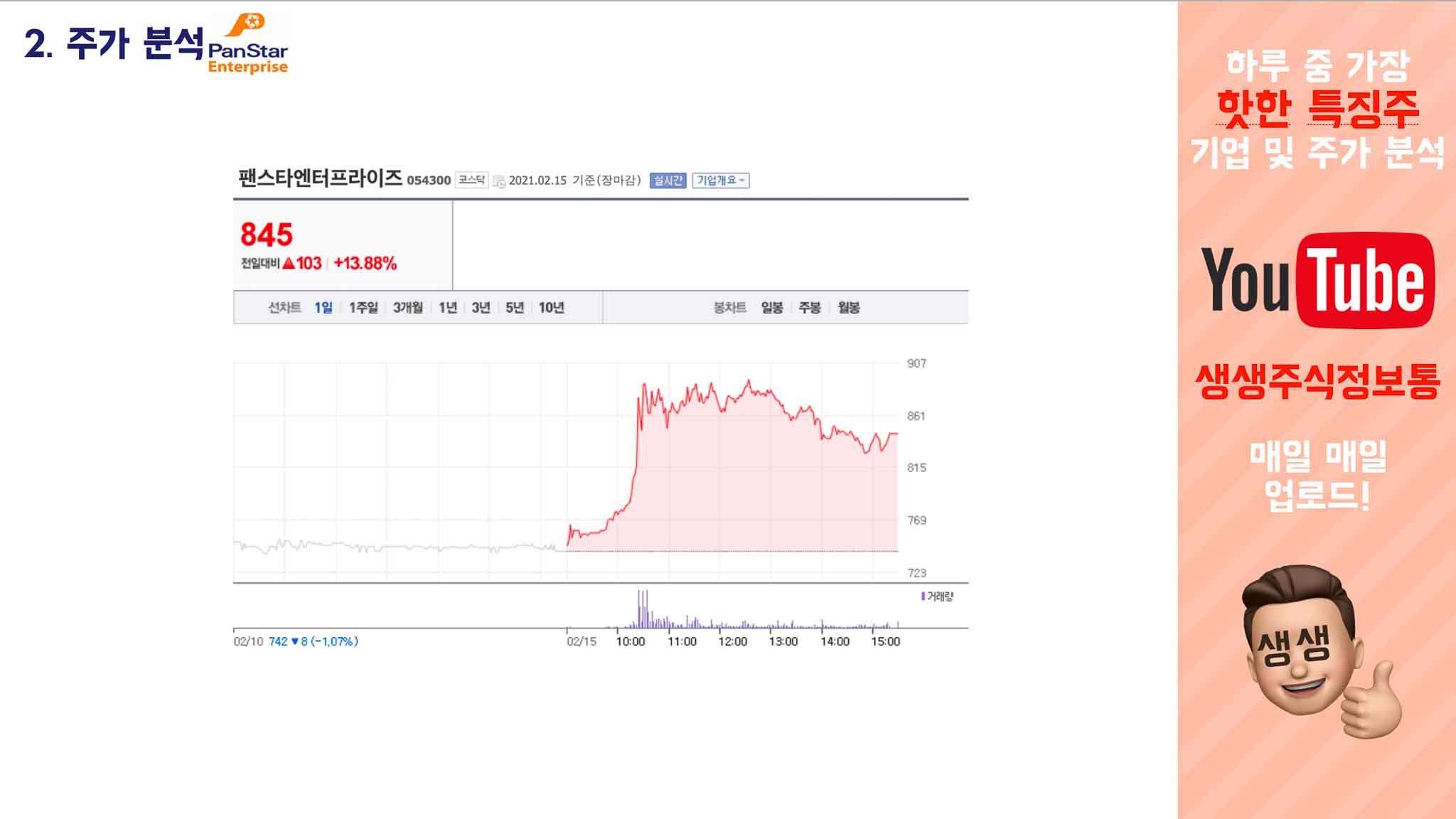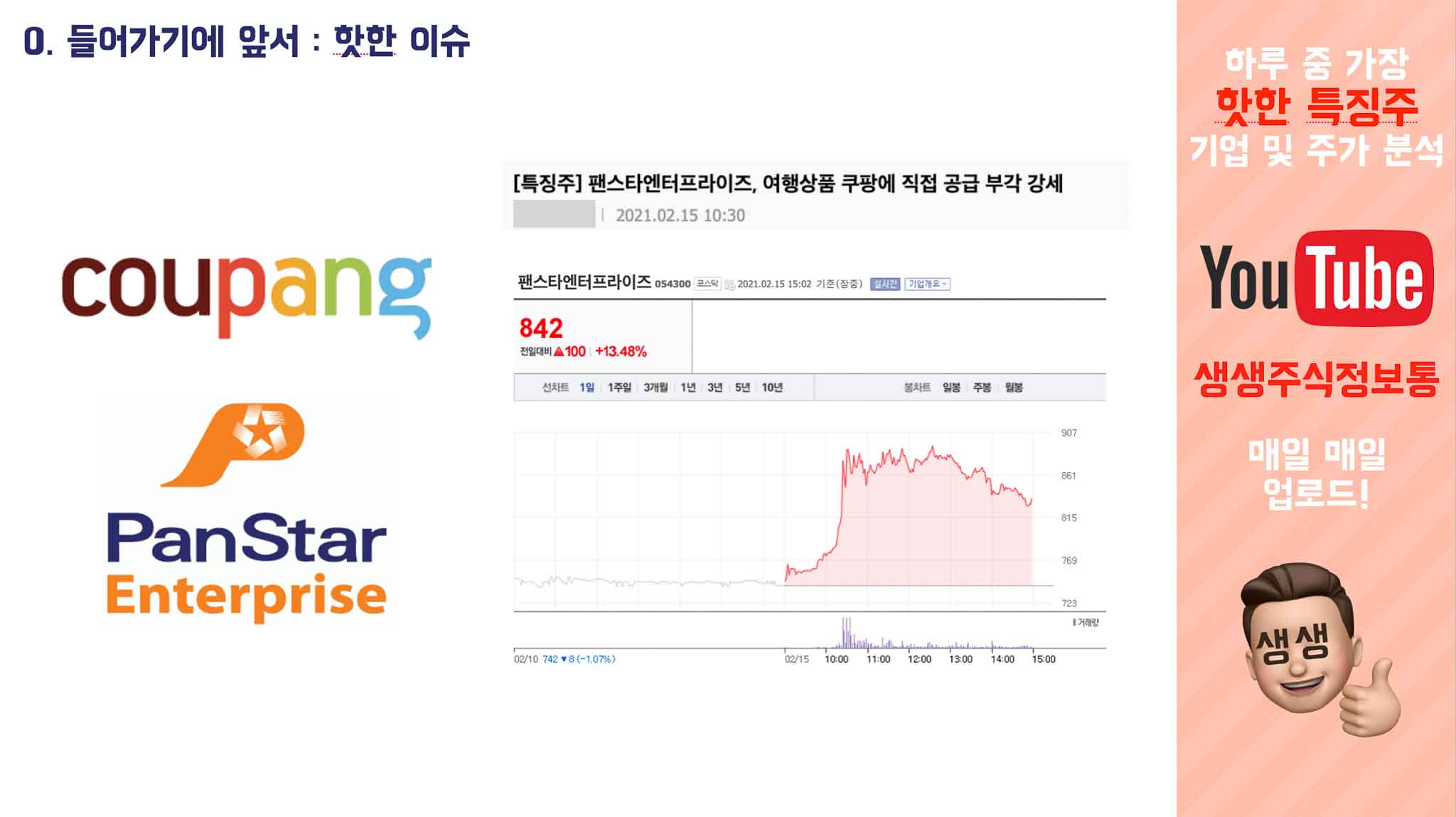 팬스타엔터프라이즈는 쿠팡 상장 소식에 같이 순풍했고, 13.8% 오른 845원으로 2월 15일 장을 마감했습니다.