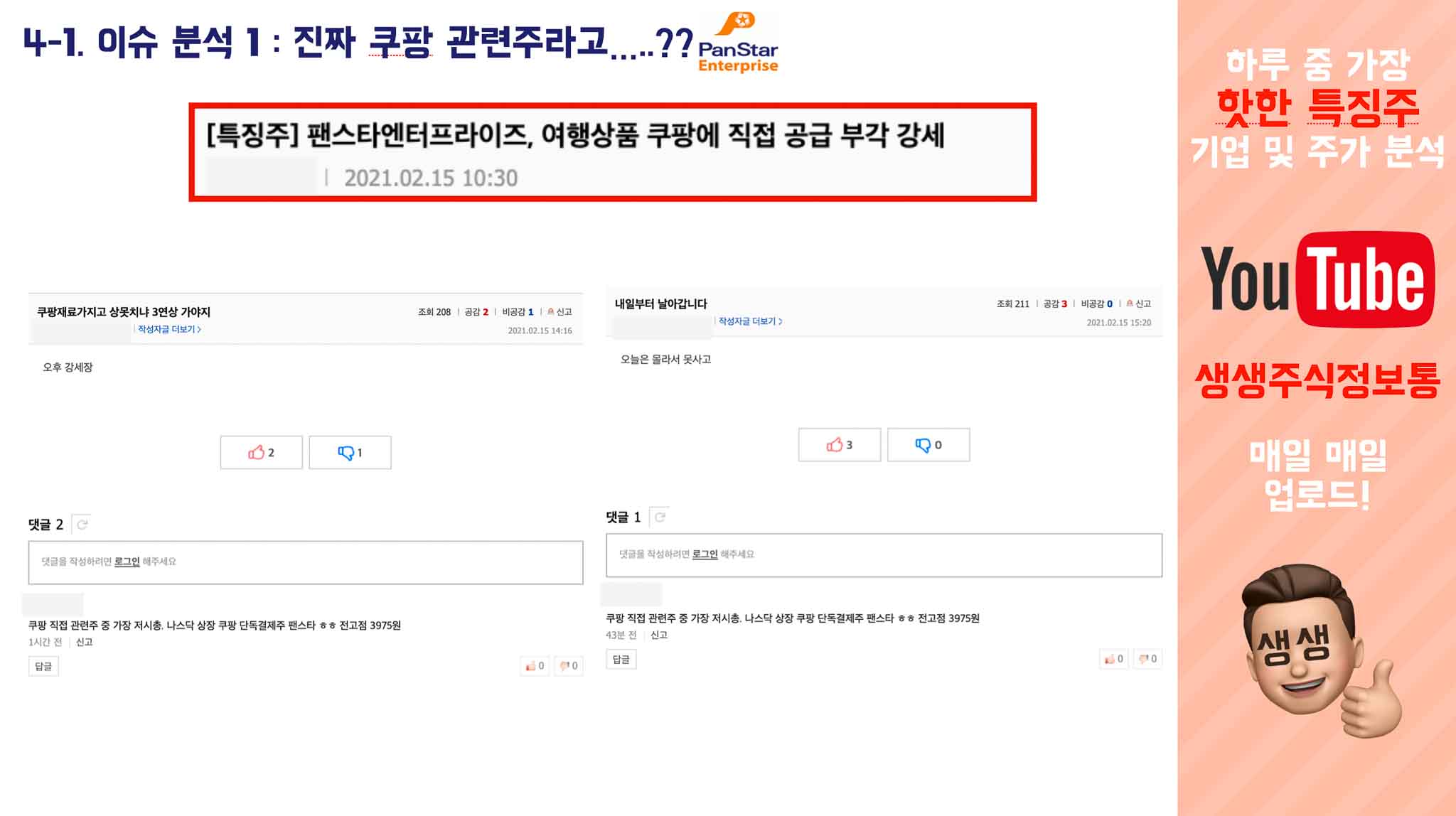 '쿠팡 직접 관려주 중에 가장 시총이 작다. 나스닥 상장 쿠팡 단독결제주 팬스타! 전고점 3975원!' 이렇게 계속 댓글을 달고 계시더라구요.