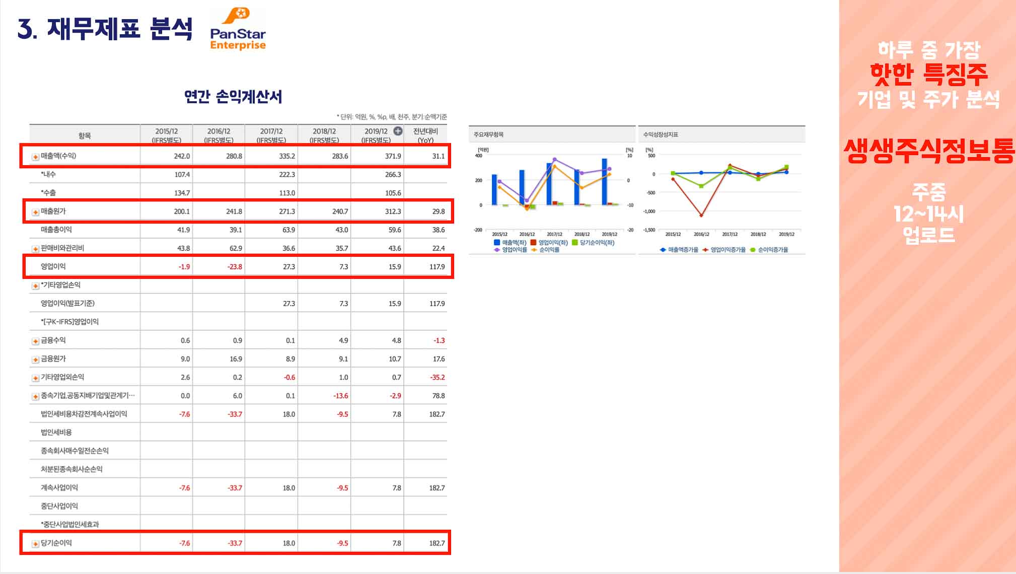 매출원가가 워낙 높은터라 영업이익은 27억, 7억, 15억으로 다소 적어보이긴 하지만, 그래도 팬스타엔터프라이즈가 된 이후부터 2019년까지는 흑자인 상황이 지속되고 있긴 합니다.