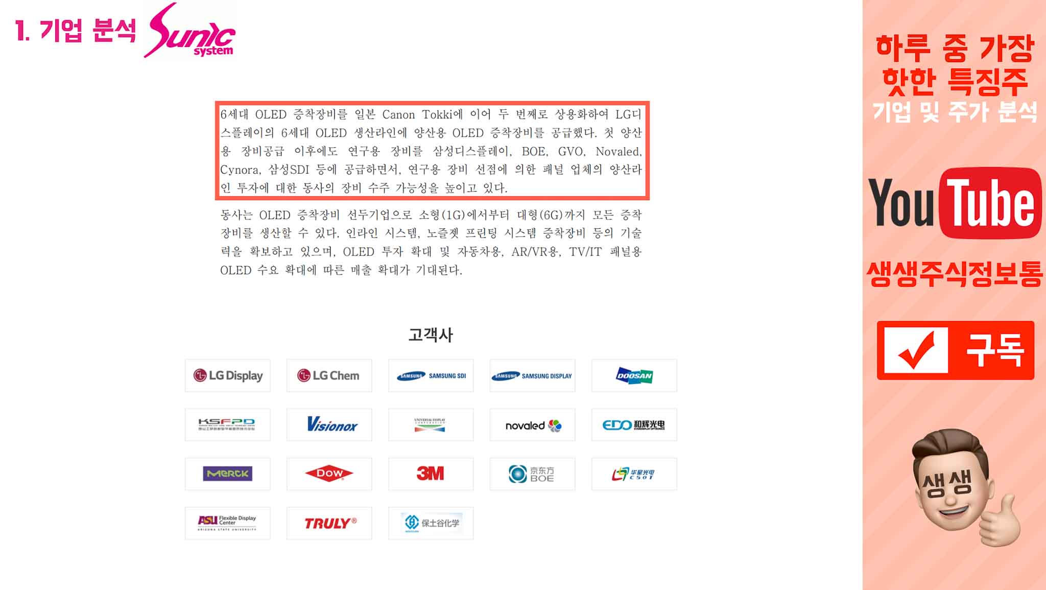 "6세대 OLED 증착장비를 일본 캐논 도키에 이어서 두번째로 상용화해서, LG디스플레의 6세대 OLED 생산라인에 OLED 증착장비를 공급했다. 첫 양산용 장비 공급 이후에도 연구용 장비를 삼성디스플레이, BOE, GVO 등에 공급하면서 연구용 장비 선점에 의한 양산라인 투자로 동사가 장비 수주할 가능성이 높다."