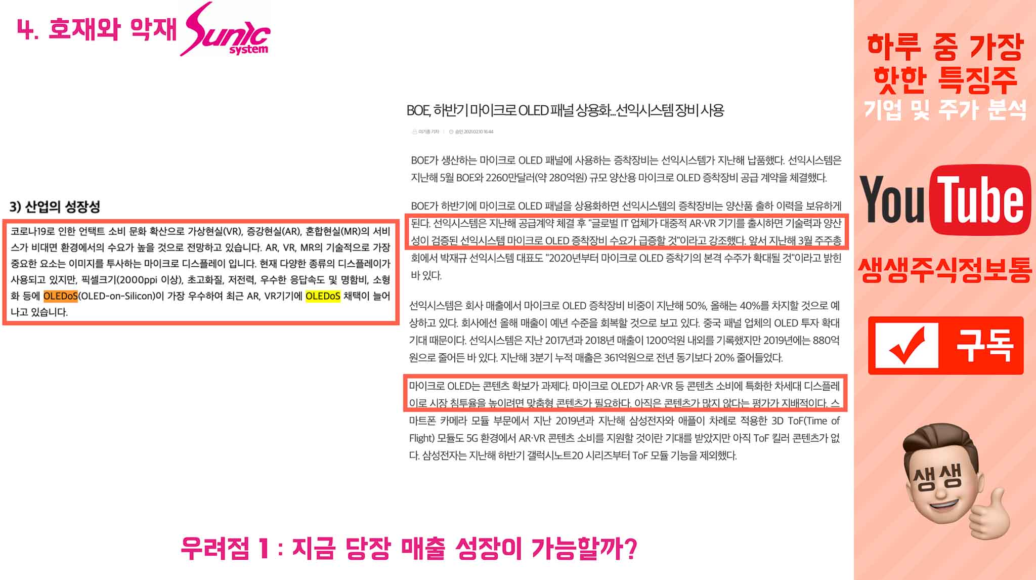 그 기사 밑에는, "선익시스템은 AR,VR이 주도할 미래 시장에 대응하기 위해 증착 장비 기술을 선도해 오고 있으며