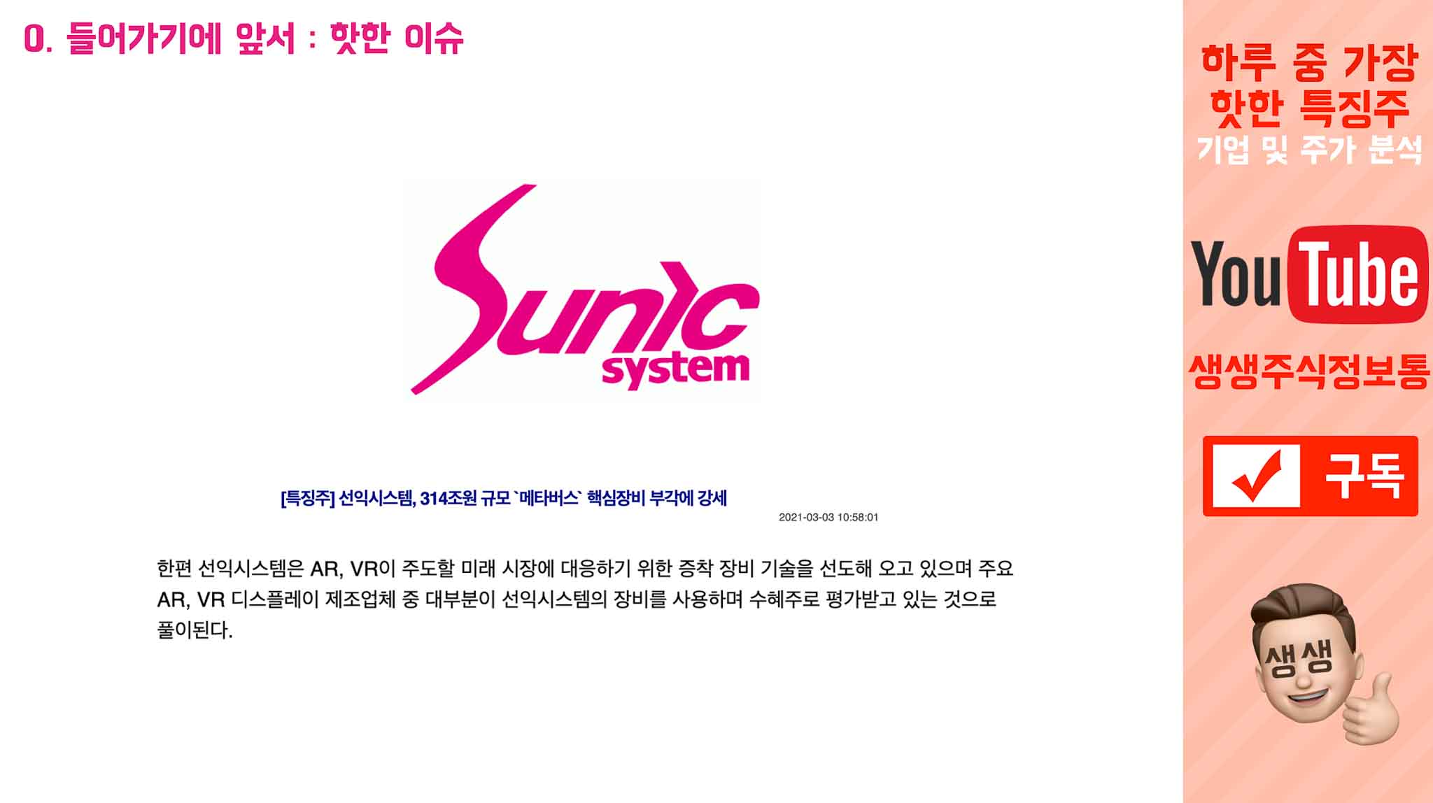 오늘 나온 기사를 읽어보면, "선익시스템, 314조원 규모 메타버스 핵심장비 부각에 강세다."