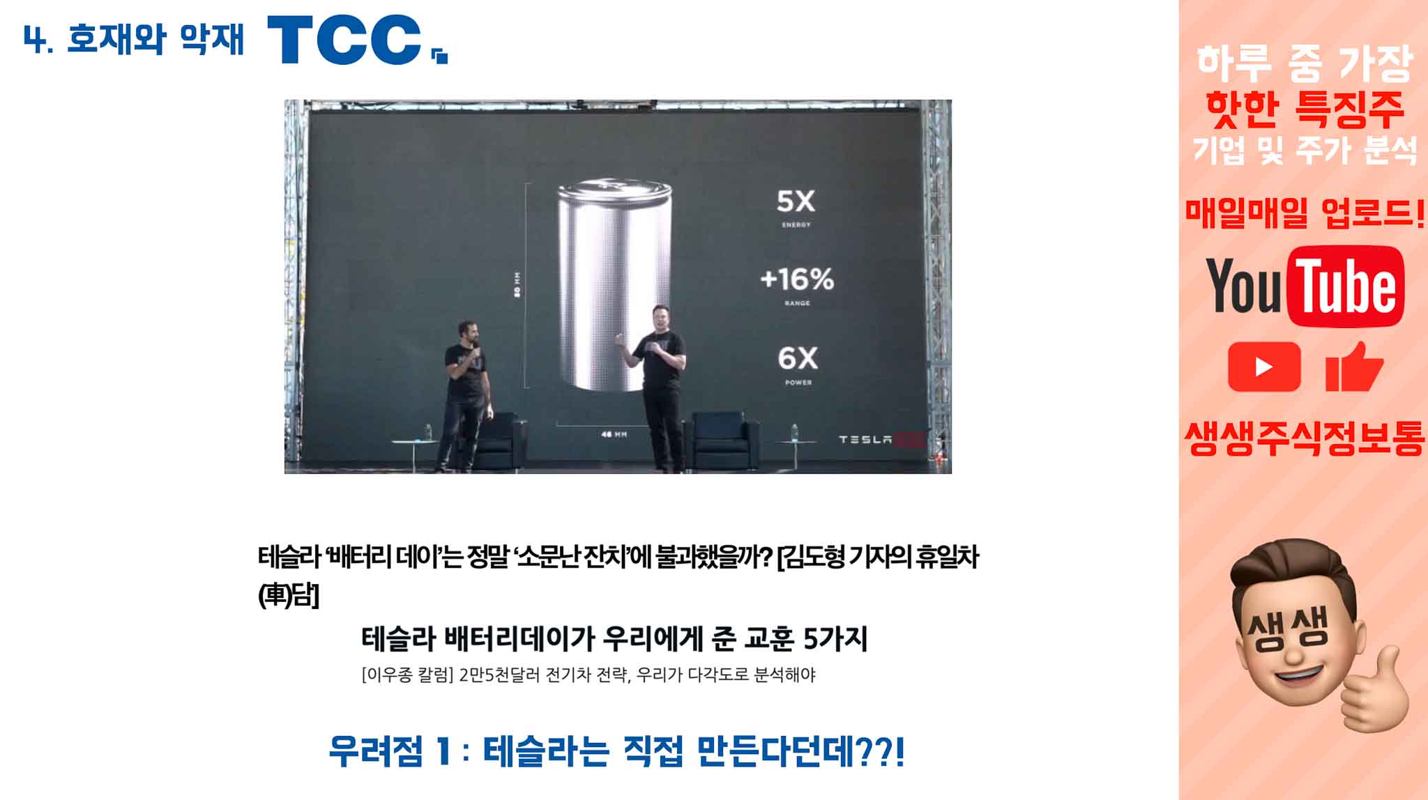 만약 직접 만든다면, 당장 TCC스틸과 연관성이 있는 LG에너지솔루션의 파이가 줄어들 것이고, 더 나아가 테슬라가 배터리를 다른 업체들에게 납품하면 파이가 더 줄어들겁니다.