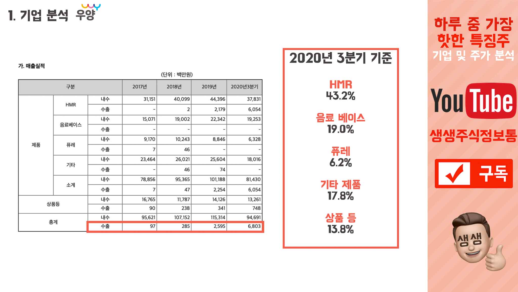 2020년 3분기 기준으로 HMR이 43.2%입니다. 상당한 수치네요. 음료베이스는 19%, 퓨레 6.2%, 기타제품 17.8%, 상품 등으로 팔린 것은 13.8%입니다.
