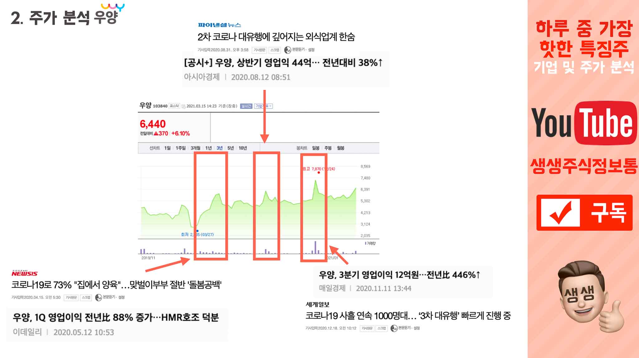 하지만 우양의 주가는 다른 기업들보다 더 빠르게 반등했는데요. 코로나 19가 본격적으로 유행했던 3월부터 5월, 집에서 양육하는 사람이 73%나 되었다는 기사도 나왔는데 그 시기에 우양은 영업이익이 전년비 88% 증가했다는 공시도 같이 나왔습니다.