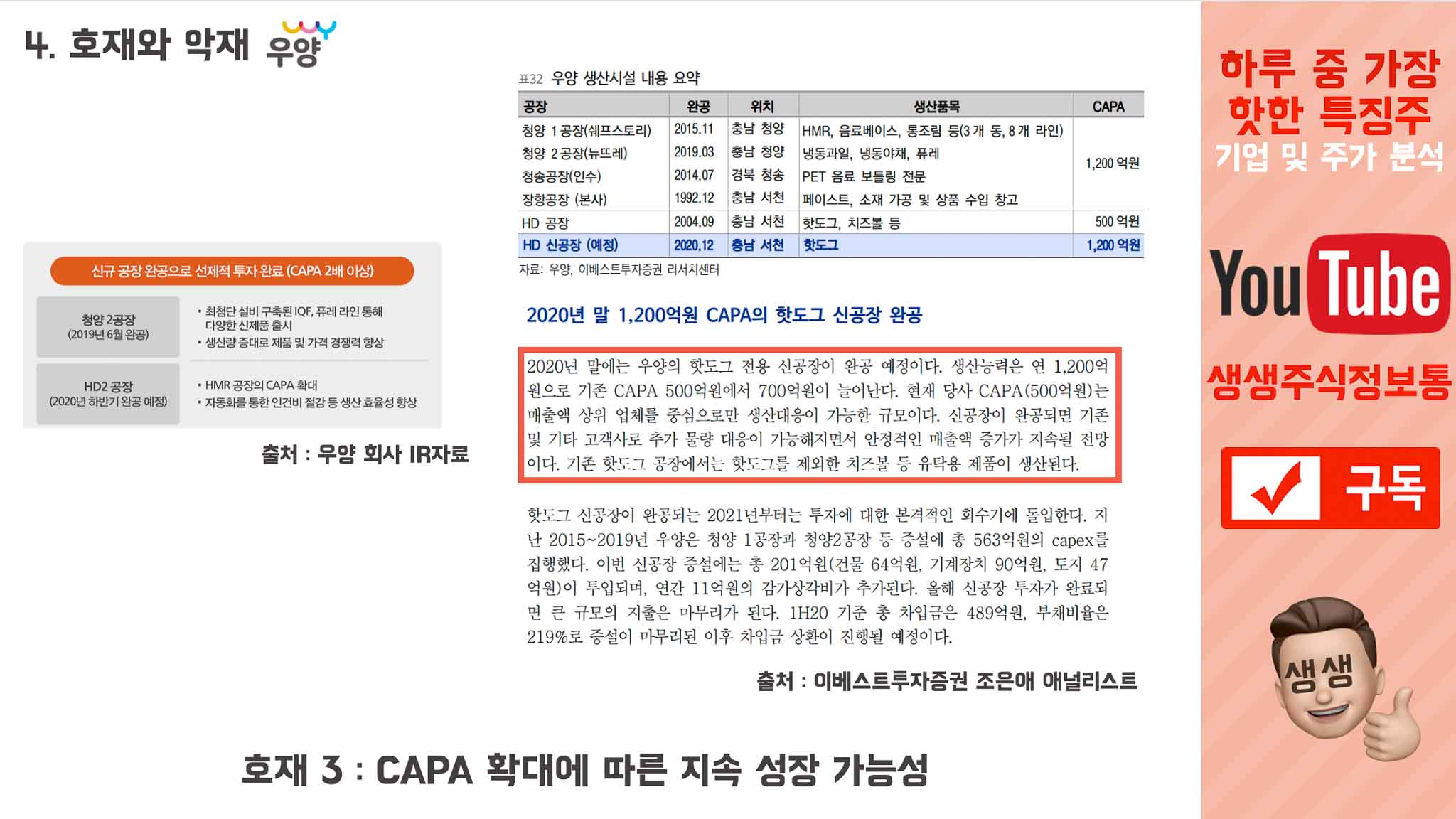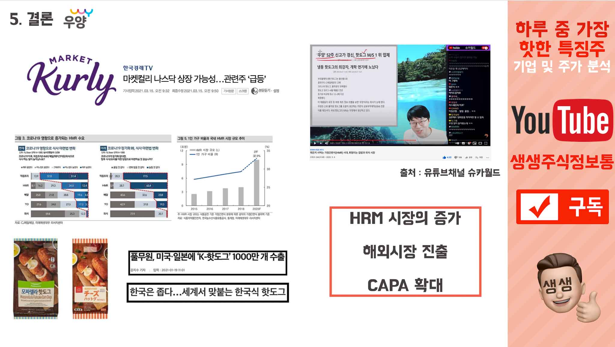 HRM 시장의 증가, 핫도그의 해외시장 진출 그리고 그에 맞는 공장 증설을 통한 CAPA 확대 등 장점이 많은 우양입니다.
