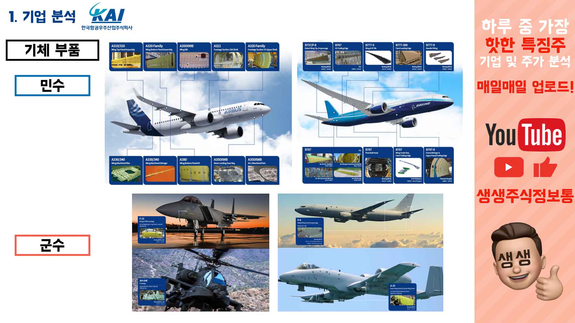 기체부품은 항공기에 들어가는 뭐 엔진, 기체구조물, 항공전자장비 등 정말 다양하는 부품을 납품하는데 군수, 민수 둘다 하고 있습니다.