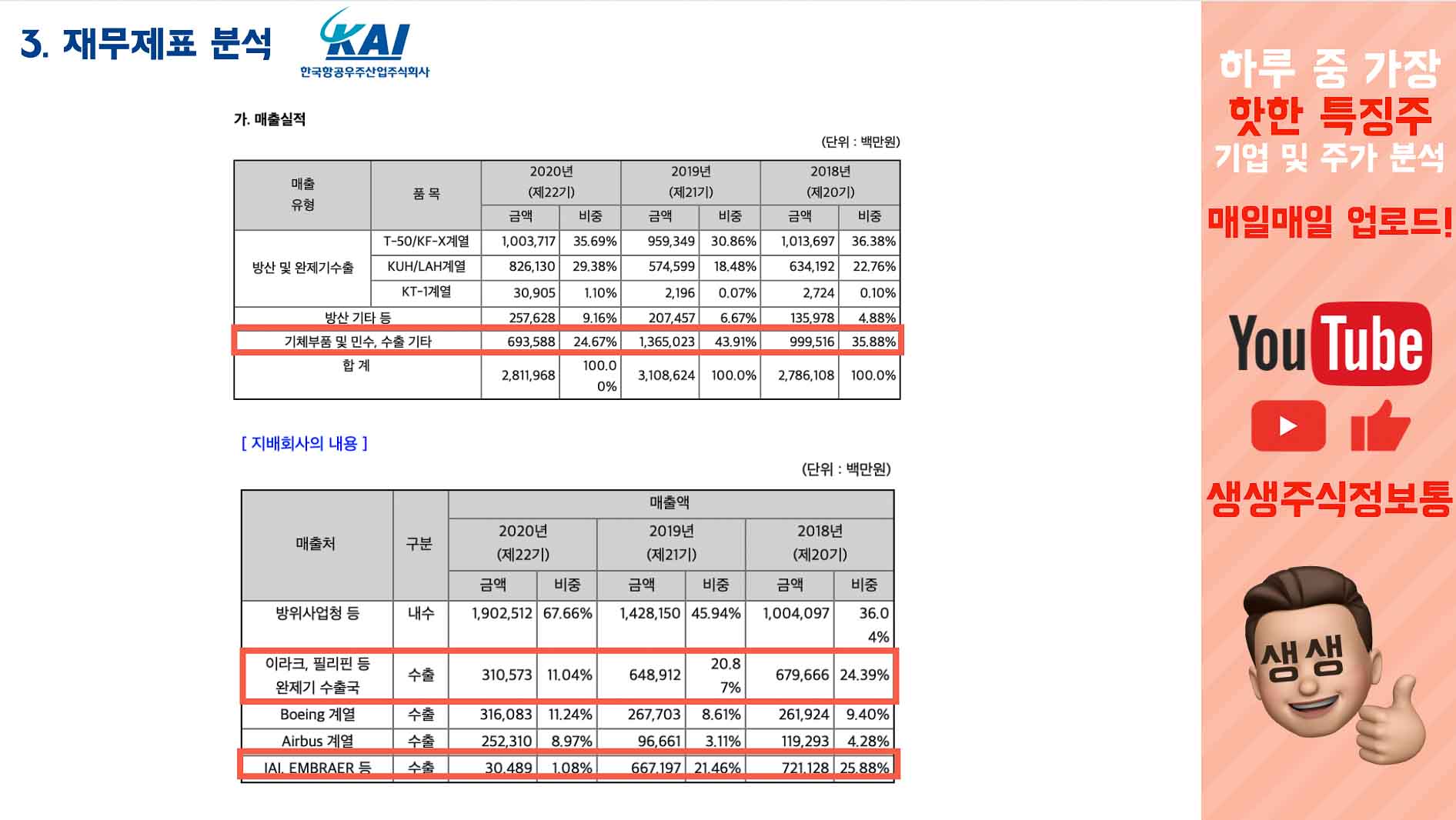 그리고 가장 큰 건, IAI 이스라엘 항공우주 산업과 브라질 항공기업 엥브라에르 등으로의 매출이 확 떨어졌습니다.