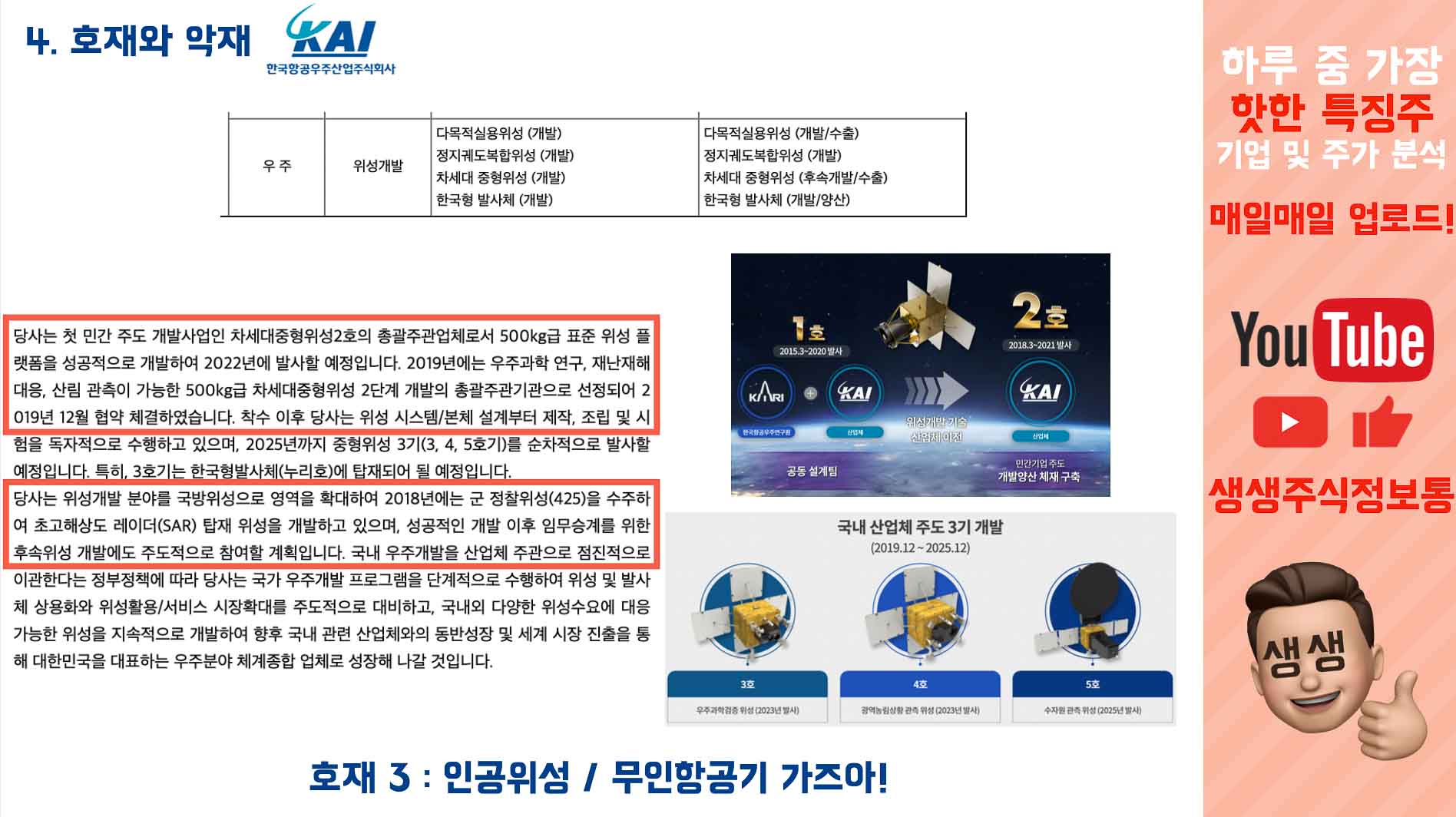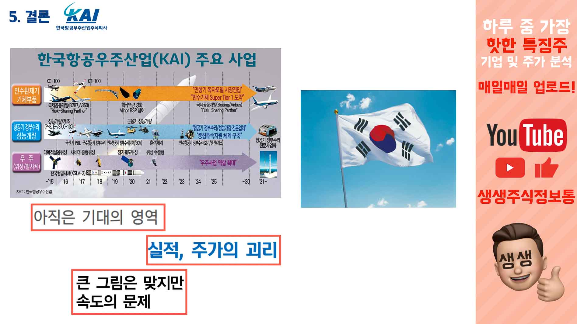 인공위성 사업, 전투기 사업 등. 시장에서 큰 기대를 하고 있는 사업들은 모두 5년 뒤부터야 이제 본격적인 시작이 되는겁니다