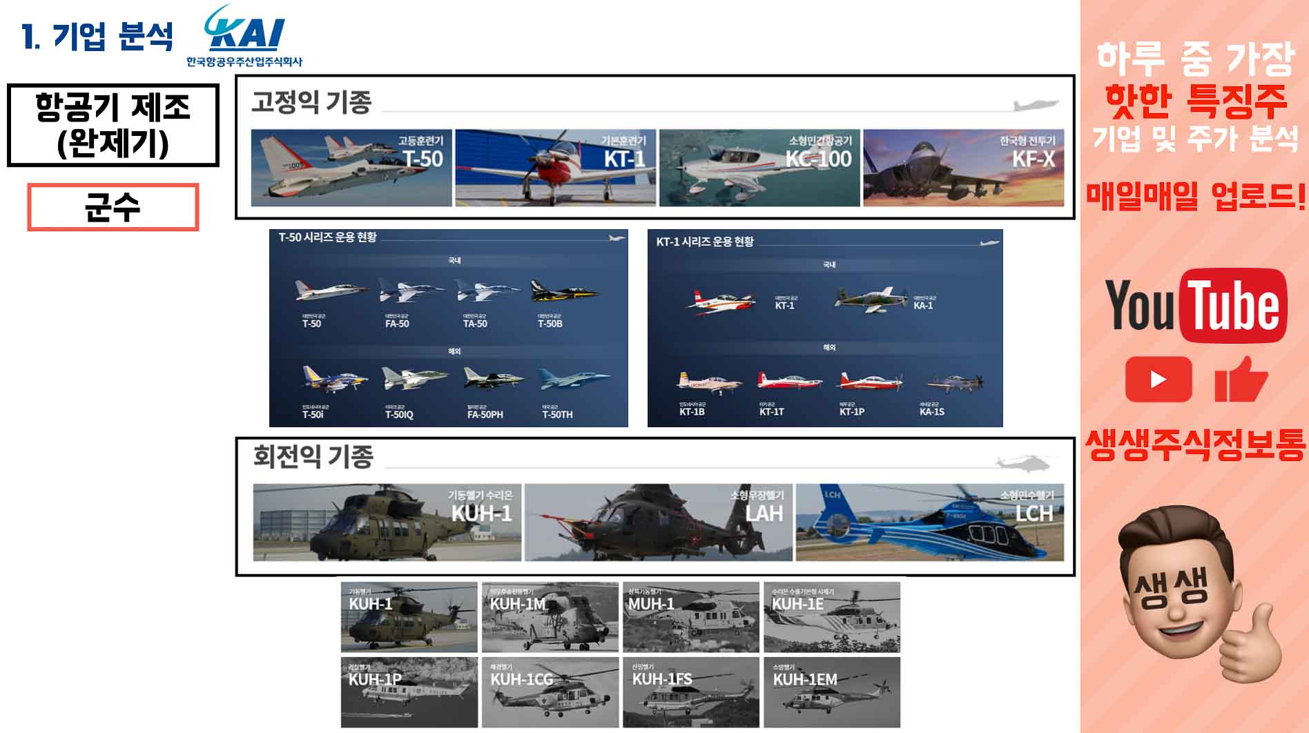 T-50 고등훈련기는 초음속 항공기인데, 공군으로 납품하며, 인도네시아, 이라크 등에 수출하기도 합니다. 그리고 T-50 기반의 FA-50 전투기도 있는데, 이것들이 고정익 메인과도 같습니다.