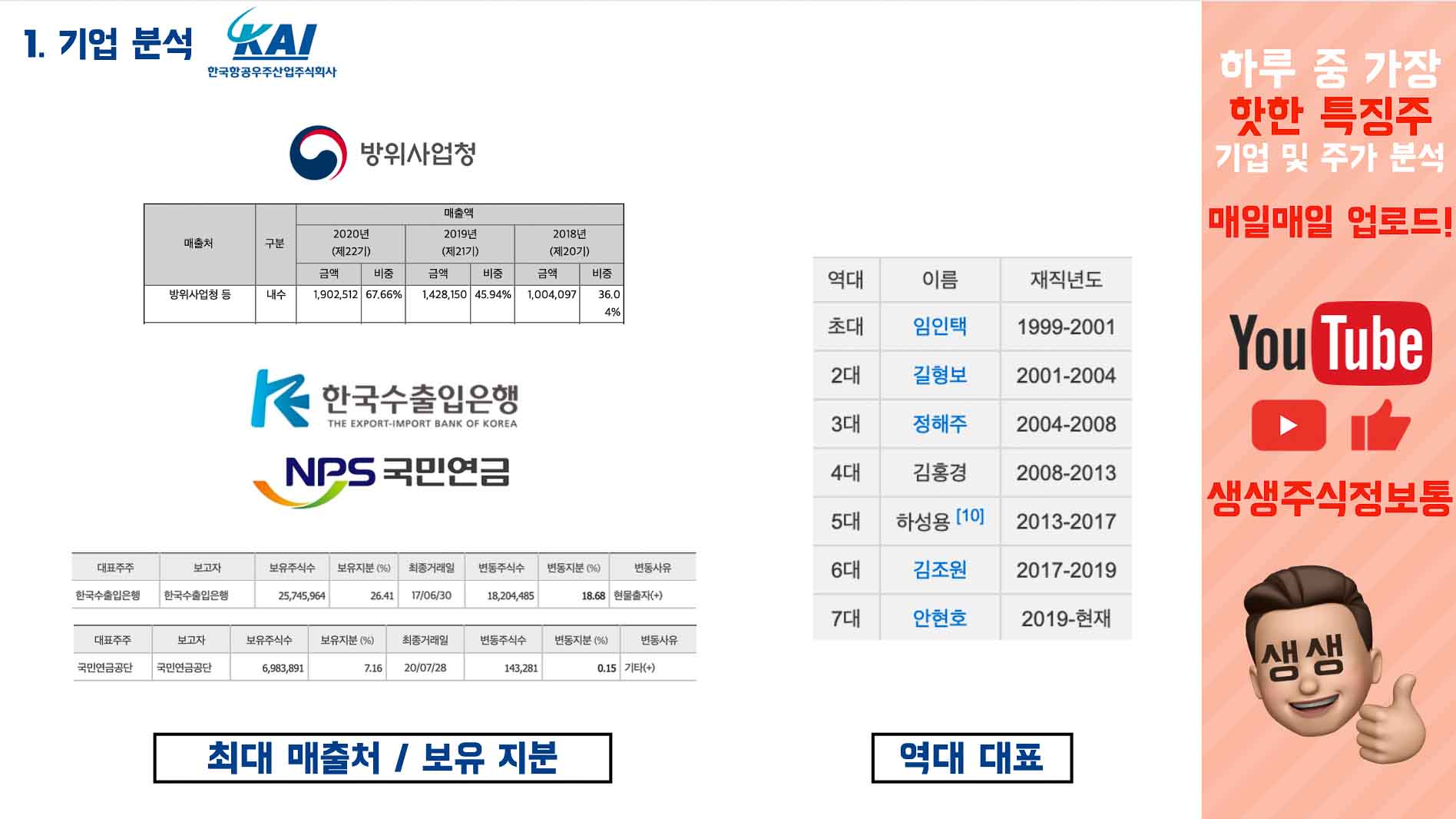 방금 봤듯 회사의 최대 매출처는 방위사업청입니다. 또한 한국항공우주의 최대주주는 한국수출입은행이며, 그다음이 국민연금으로 7.16%입니다.