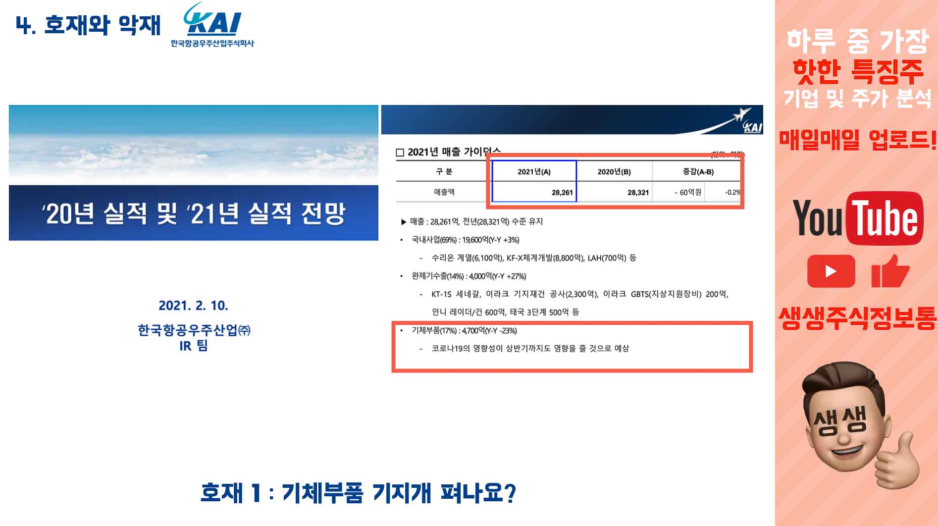 한국항공우주에서 2021년 2월 10일에 발표한, 20년 실적 및 21년 실적 전망입니다.