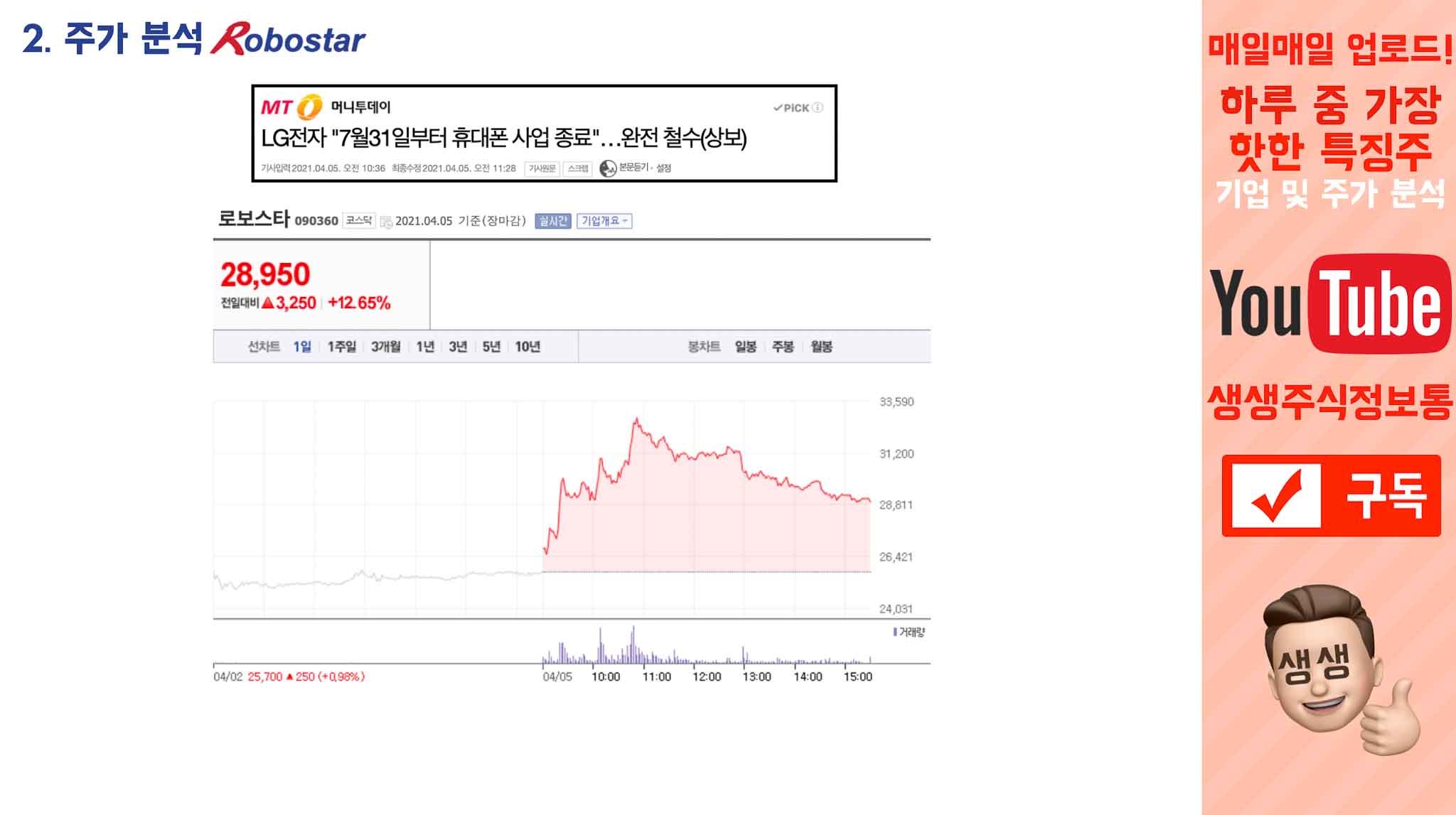 '그렇다면 로봇 사업에 더 집중하겠지?!' 하는 기대감으로 오늘 로보스타는 뉴스와 동시에 쭉쭉 상승했습니다.