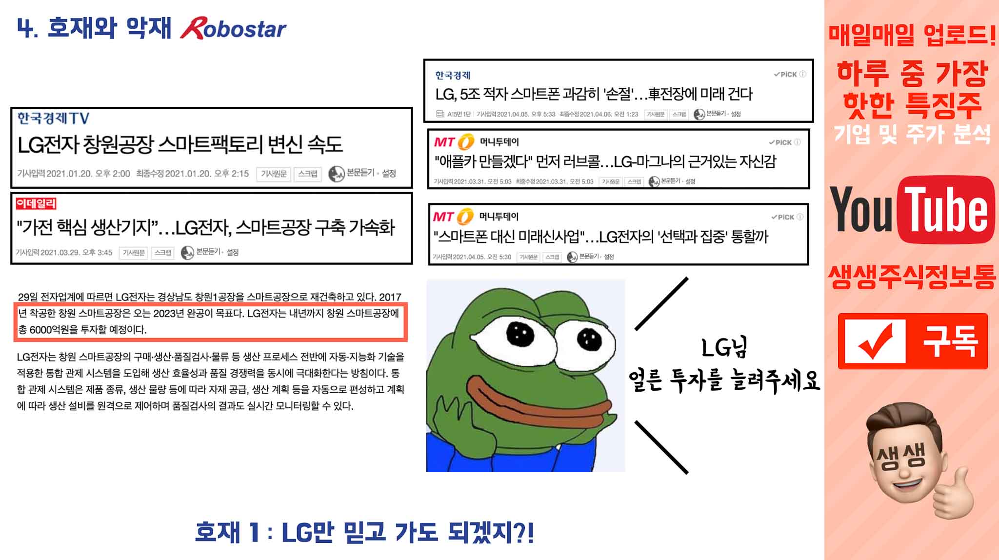 만약 로보스타를 투자하고 계시거나, 투자하려는 분이시라면 "로봇"이라는 타이틀말고 "LG가 어디에 투자할거래! 어디 공장을 늘릴거래! "이런 뉴스들에 더 귀를 기울이시길 바라며,