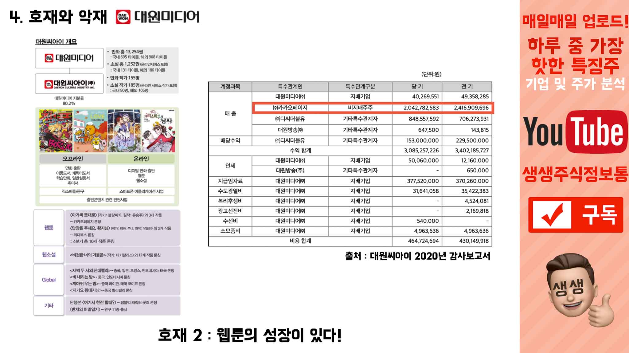 카카오페이지는 웹툰, 웹소설 등을 연재하고 판매하는 곳인데, 대원씨아이 2020년 매출 중 대부분이 카카오페이지에서 났습니다.