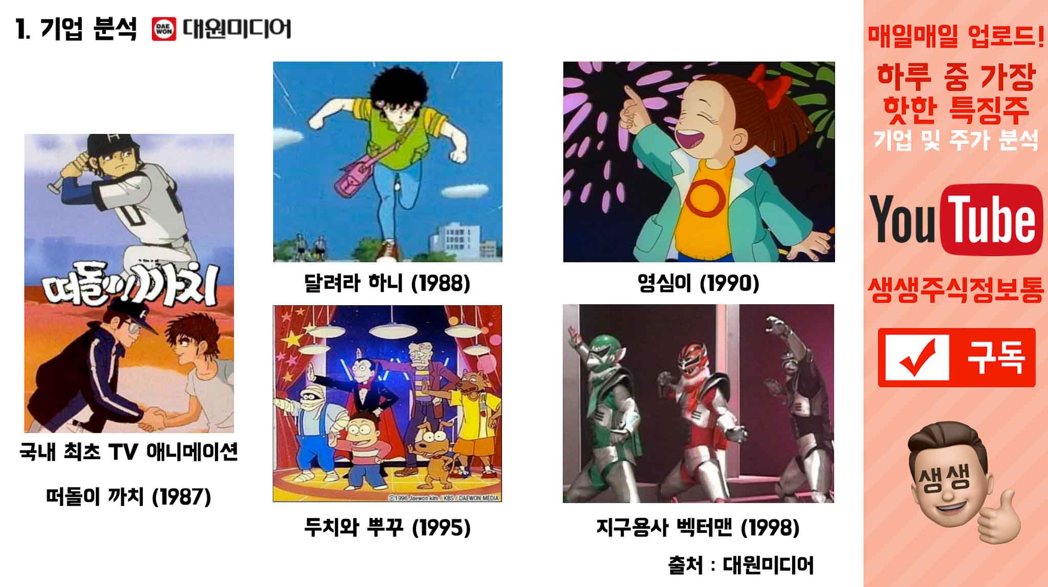 대원미디어는 떠돌이까치, 하니, 영심이, 백터맨 그리고 소년 챔프 등.어린이들을 사로잡을 애니메이션과 만화 콘텐츠로 잘 성장해왔습니다.