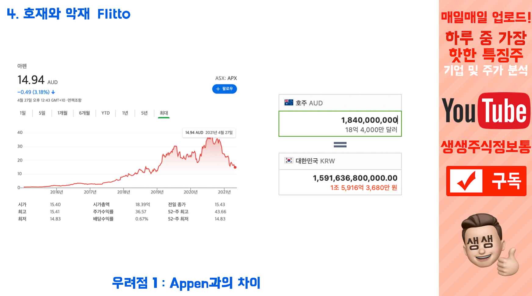 에이펜 주가가 많이 내려오긴 했네요. 그래도 지금 기준으로 봐도 에이펜의 시총은 18억4천만 호주달러로 한화로는 1조 6천억입니다.