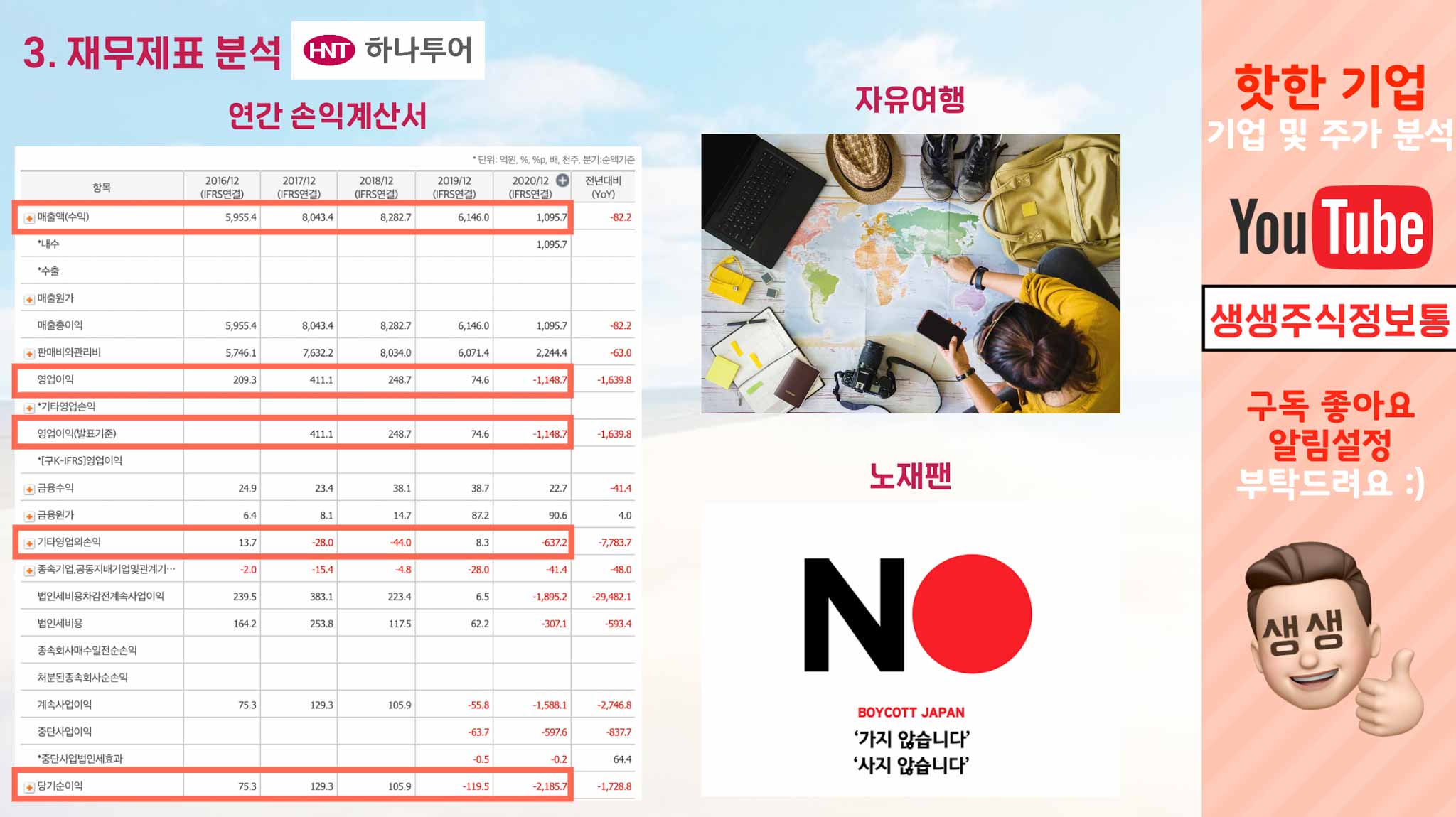 하나투어는 일본에서도 많은 매출을 일으키고 있었는데요. '가지 않습니다. 사지 않습니다.' 보이콧 재팬으로 하나투어는 타격을 많이 받았고, 매출액은 6000억으로 떨어집니다.