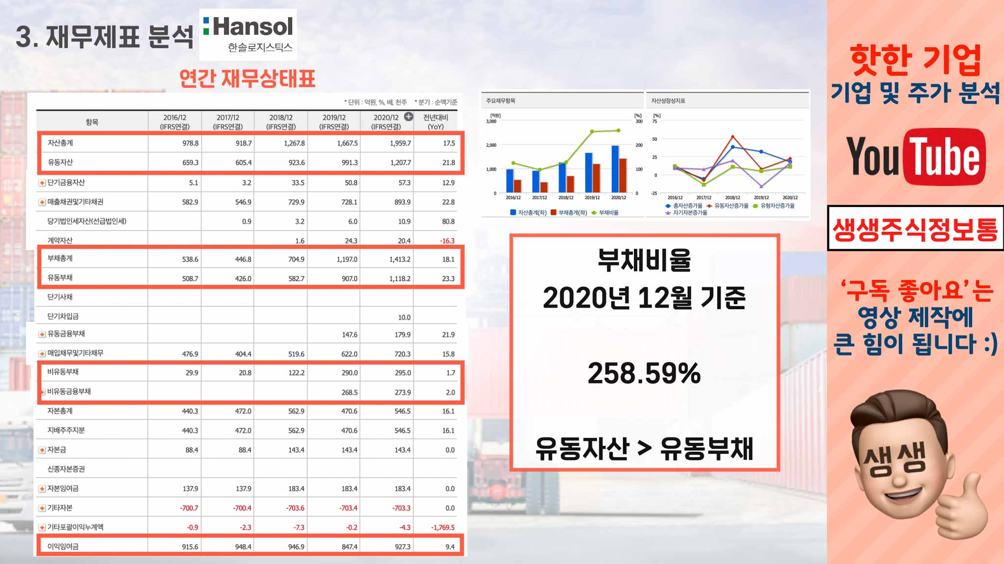 물류기업들은 부채비율이 대부분 높으나, 한솔로지스틱스는 2020년 기준으로 258%이니, 산업군 내에서도 조금은 높은편에 속하는구나. 이렇게 이해하시면 좋겠습니다.