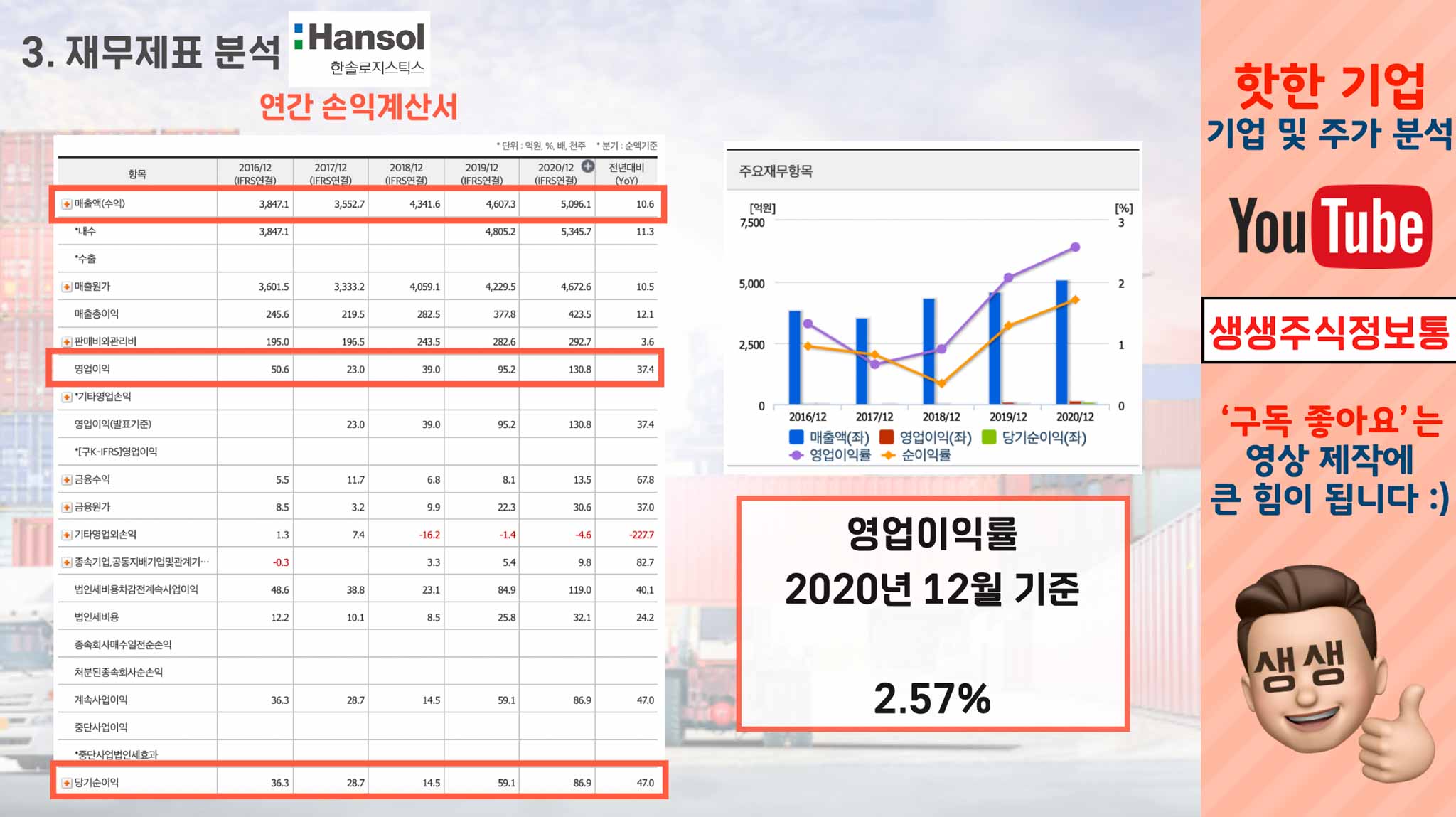 하지만 한가지 생각해야할 점은 물류서비스 특성상 영업이익률이 그리 높지 않다는 점, 그래서 매출이 많이 늘어난다고 하여, 영업이익도 기하급수적으로 많이 느는것은 아니라는 점은 알아두셔야 할거 같습니다.