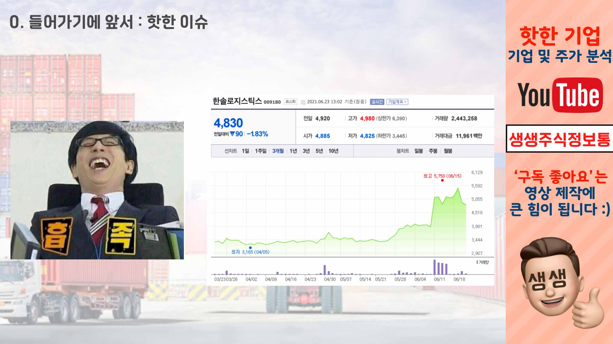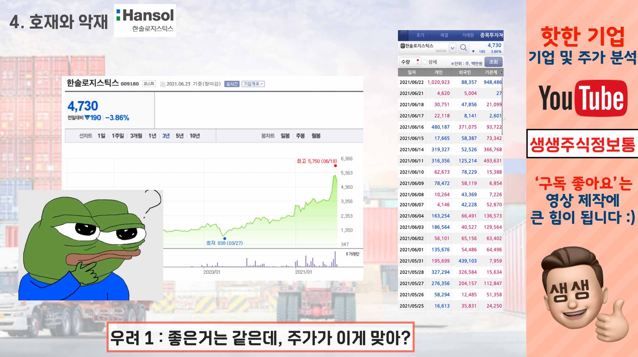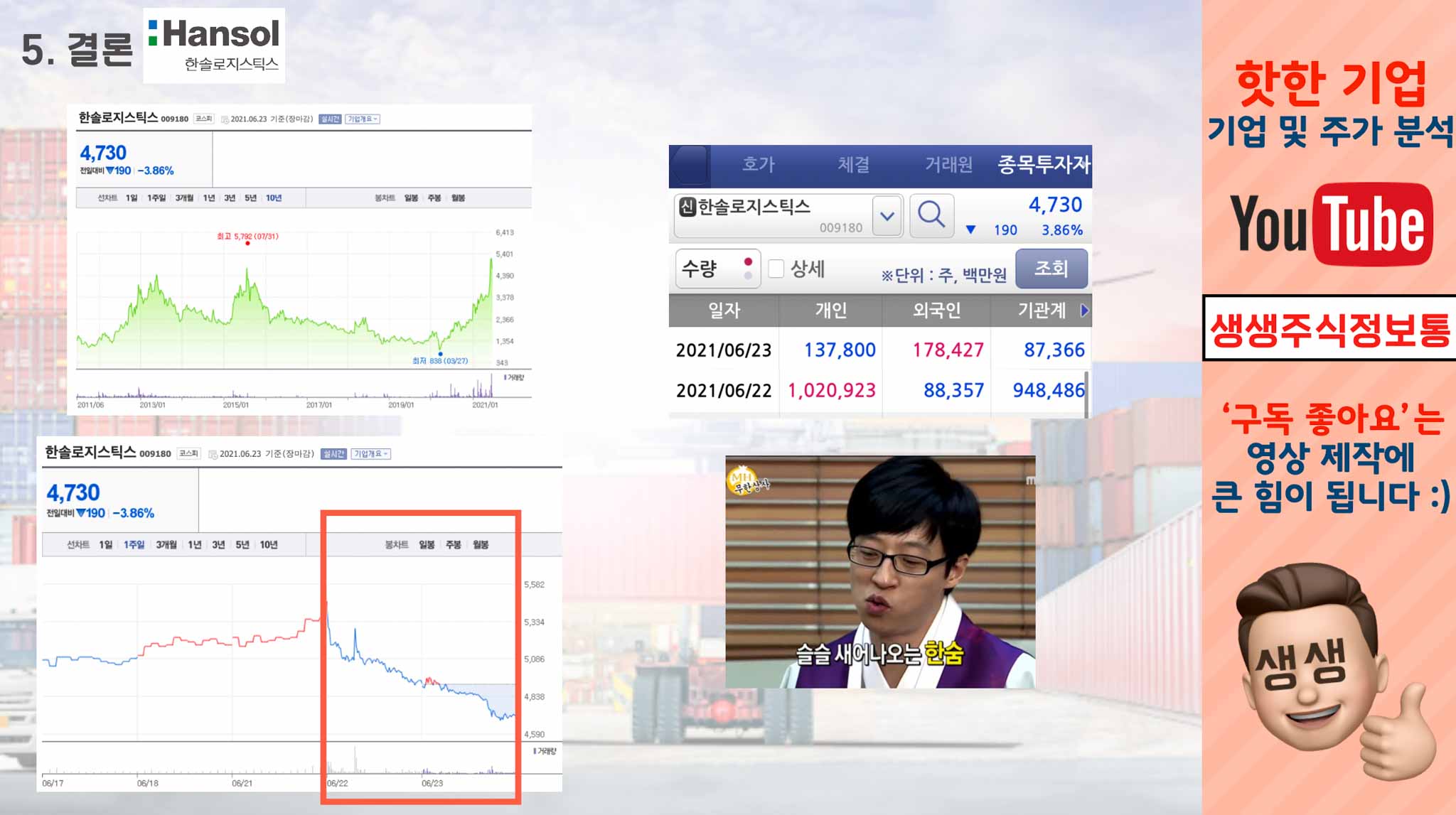 한솔로지스틱스는 6월 23일, 3.86% 하락한 4730원으로 장을 마감했습니다. 코스피, 코스닥은 상승했지만 한솔로지스틱스는 주가가 떨어졌는데요.