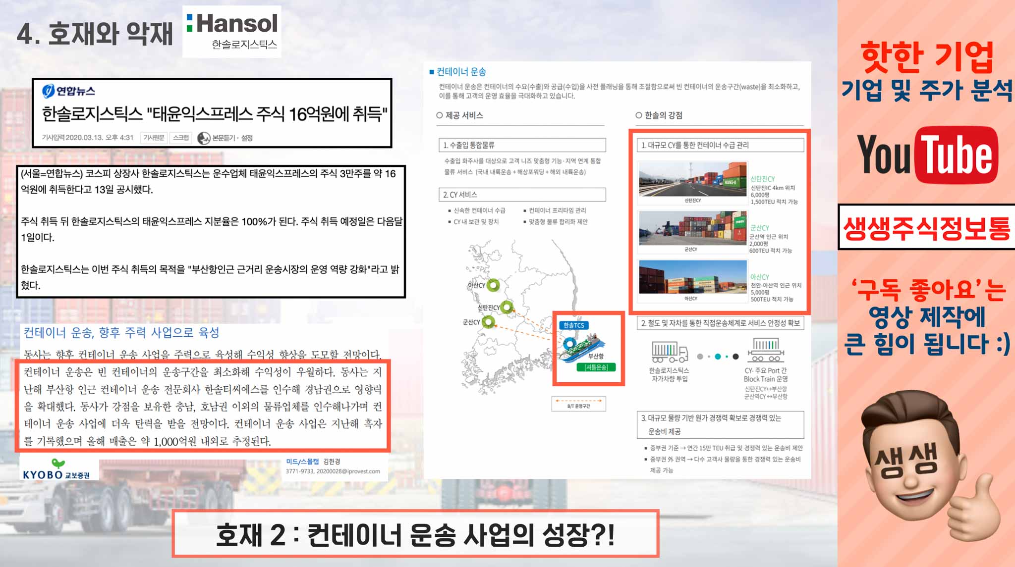 지금까지 한솔로지스틱스가 어떻게 성장해왔는지 살펴봤다면, 이제는 호재와 악재를 통해 한솔로지스틱스가 어떻게 나아갈지 살펴보겠습니다.