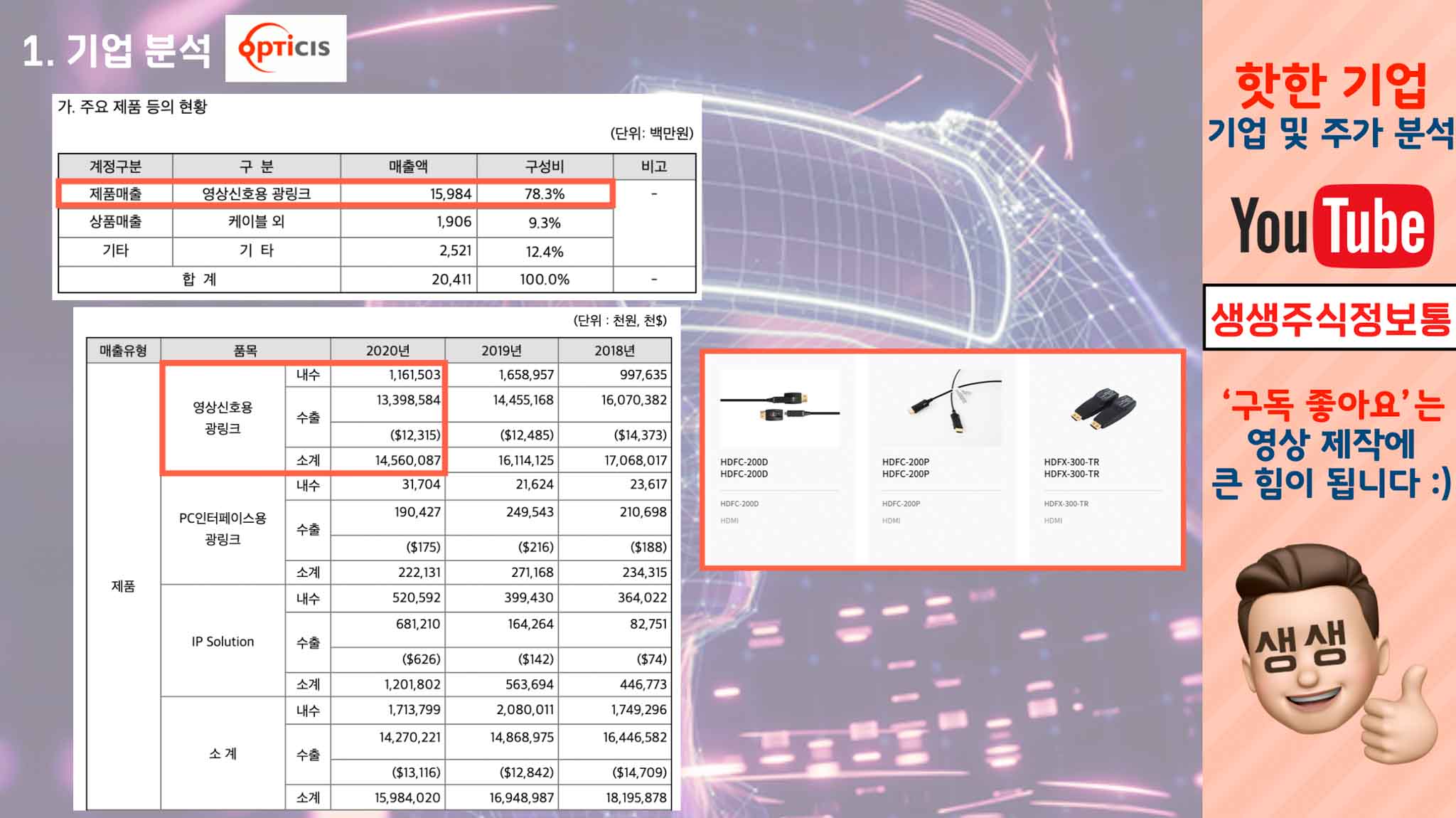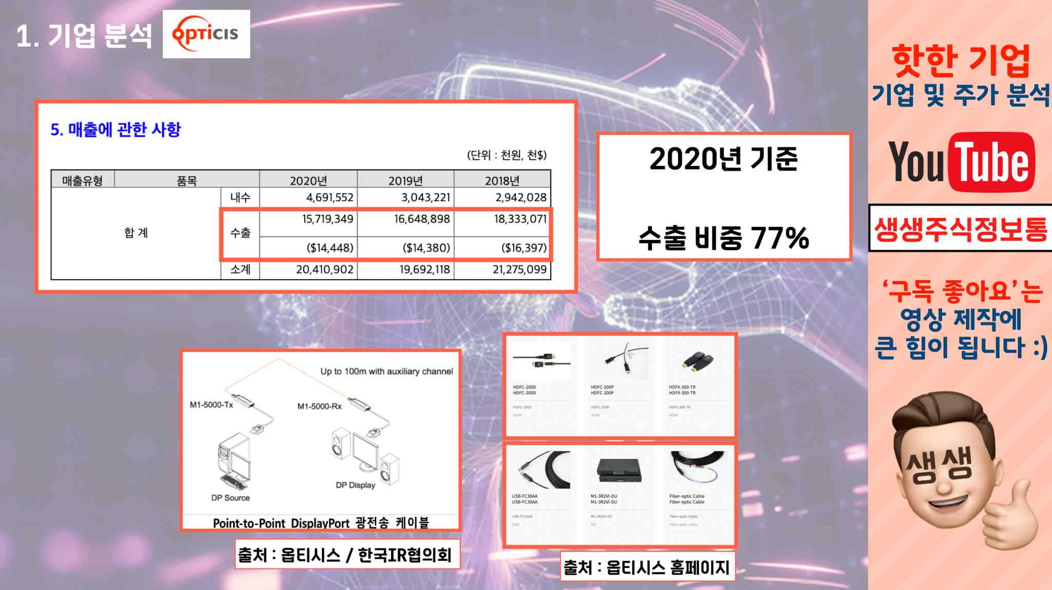 기업 분석을 종합해보면, 우리가 보는 티비, 데스크탑 모니터등은 영상을 출력하기만 하는 기기로 영상을 재생하는 기기들은 본체, 셋탑박스 등 따로있다. 옵티시스는 이 둘을 이어주는 광링크 제품을 판매하는 기업이다. 그리고 수출에서 비중이 상당히 높다.