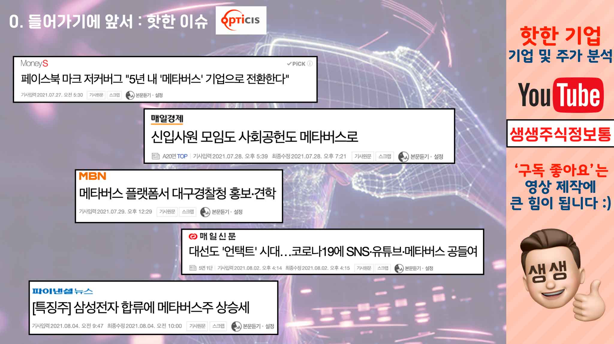 지난주 메타버스 관련주 맥스트가 상장하면서, 그리고 페이스북의 메타버스 기업 선언과 함께 옵티시스도 많이 올랐었는데 오늘은 삼성전자까지 메타버스에 뛰어들 것이다! 라고 하면서